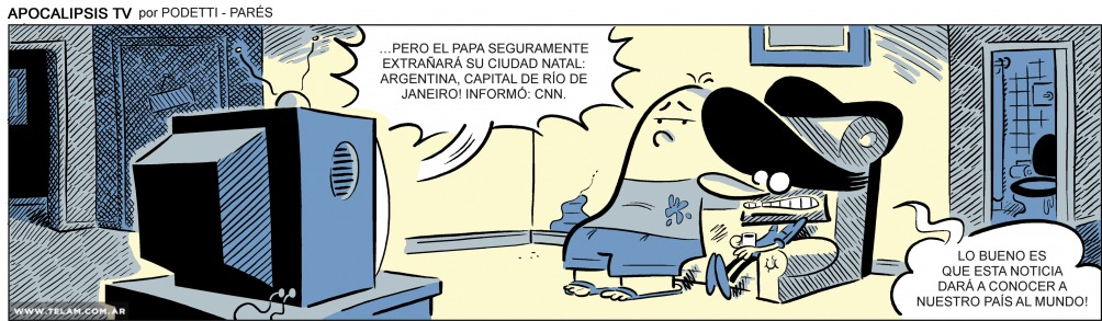 E.P.: Y ahora estoy haciendo bastante humor político para Télam [Agencia Nacional de Noticias, con la tira Apocalipsis TV], con Diego [Parés]. Es un humor bastante panfletario, digamos, pero que no me parece mal. Es humor hecho con una intención ideológica y política bastante clara, no hay ambigüedad. Y eso tiene un valor también, porque tenés muy claro desde dónde estás hablando. En Barcelona hago lo que se me da la gana, porque no siempre es político el humor ahí, también trabajo con la obscenidad y otros temas. Pero cuando me da bronca algo de la política argentina, siento que lo puedo volcar en la historieta de La embarazada mala, que es más violenta y más asquerosa, y tengo toda la libertad de hacerlo. Y para Barcelona, cuanto más sacado y violento, mejor, es el lema de ellos [risas]. En Télam sos parte del rostro oficial de la comunicación estatal, no podés ser muy violento, y hay cosas que no me gustaría decir y capaz que alguna autoridad sí le gustaría decir. Un chiste sobre la izquierda, los cortes o los paros…es complicado, entrás en un terreno pantanoso.