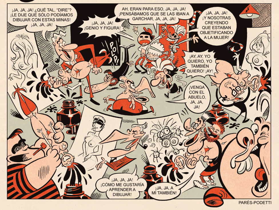 E.P.: Nació un poco por querer contraponer esta imagen que se tiene del dibujante como una especie de loser que está siempre en su casa y no sale con minas… Ese tipo de imagen tan triste y tan extendida. Queríamos presentar la idea de algo que pudiera ser todo lo contrario, el dibujante como una especie de playboy, con putas y falopa y etc., etc. Creo que el único ejemplo así que tenemos es [Guillermo] Divito, que era un poco así, el tipo daba esa imagen.