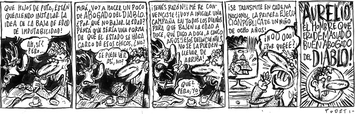 E.P.: Y me parece buenísimo que exista ese espacio, ojalá que siga evolucionando. A mí me gustaría que además de esta cosa del humor tan directo y salvaje – que está muy bueno – pudieran contarse historias, desarrollar personajes que son el corazón de la historieta. Cuando uno lee historieta no sólo piensa en la gráfica o en el concepto, sino también en el personaje. Dicen “historieta”, y se te viene a la mente el Gato Félix, la Pequeña Lulú, Tintín, etc. Eso es un poco lo que está faltando, no hay personajes tan fuertes. Y es básicamente porque para desarrollar un personaje fuerte tenés que tener mucho tiempo y espacio de desarrollo.