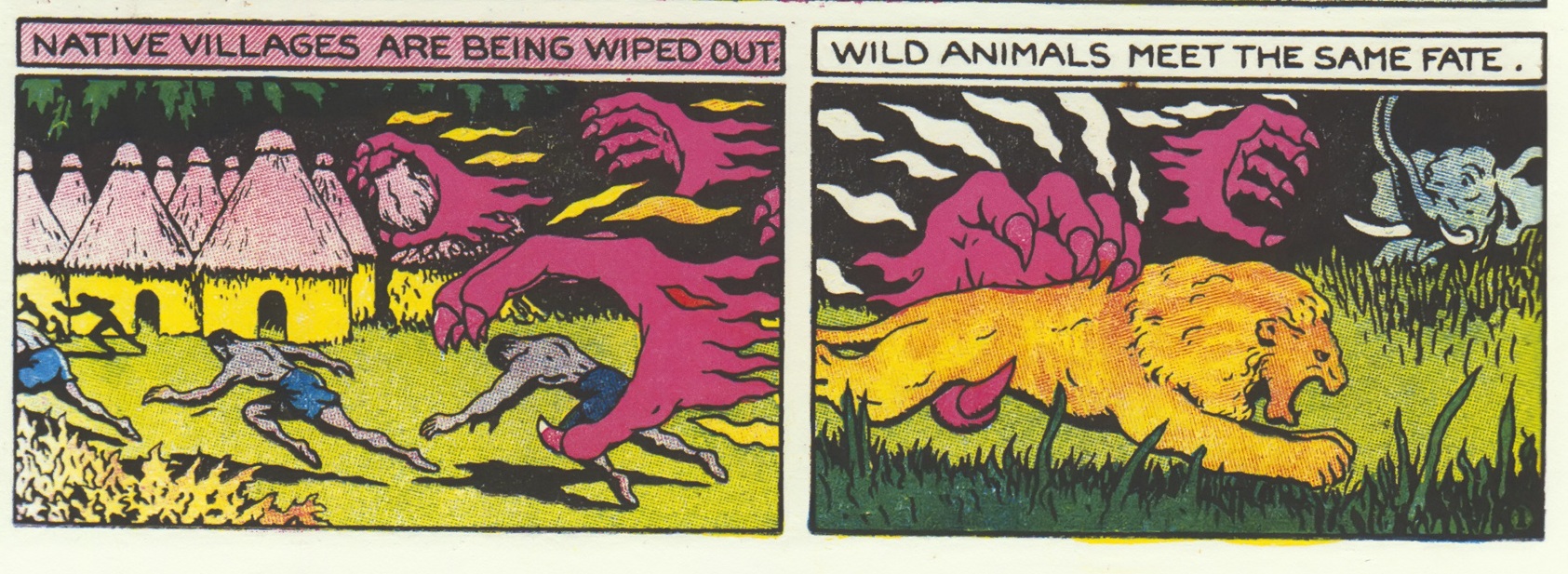 3) Hay una serie de motivos recurrentes en el trabajo de Hanks. Uno de ellos son las cosas suspendidas en el aire. Desde Stardust viajando en su “tubular spacial” (que en realidad es solo un aura de energía que lo envuelve), hasta gigantescos buitres extraterrestres, pasando por esqueletos que son confrontados con sus asesinos mientras flotan y cabezas lanzadas como escupidas a través del espacio. Hay algo para Hanks, pareciera, de impotencia en estar liberado de la fuerza de la gravedad, del peso, de la fricción y el choque. Otro motivo recurrente consiste en la ciudad de Nueva York siendo destruida, una y otra y otra vez, con monomanía recurrente, la ciudad más importante del mundo en la realidad y también en el micro-universo que construye el dibujante. Después está el planeta Venus, avanzada de la civilización que no se diferencia demasiado de la Tierra. Los pequeños monstruos de Marte y de los cometas y del interior del vacío de un planeta, a veces anaranjados, a veces verdes, siempre con púas y protuberancias a lo largo de todo su cuerpo. Los animales, empleados en Fantomah especialmente, como una especie de ejército de reserva fácilmente manipulable por los villanos y también disponible para la causa del bien. Los animales voladores, ya sea para alejarlos del peligro o para evitar que dañen a los seres humanos. El destierro en el espacio: a bordo de un planetoide o cometa, aislado de la civilización. Lo que más me llama la atención, sin embargo, es que haya podido exprimir más de una historieta a un personaje que se dedica a ser un leñador de esos que bailan sobre troncos flotantes en las montañas norteamericanas.