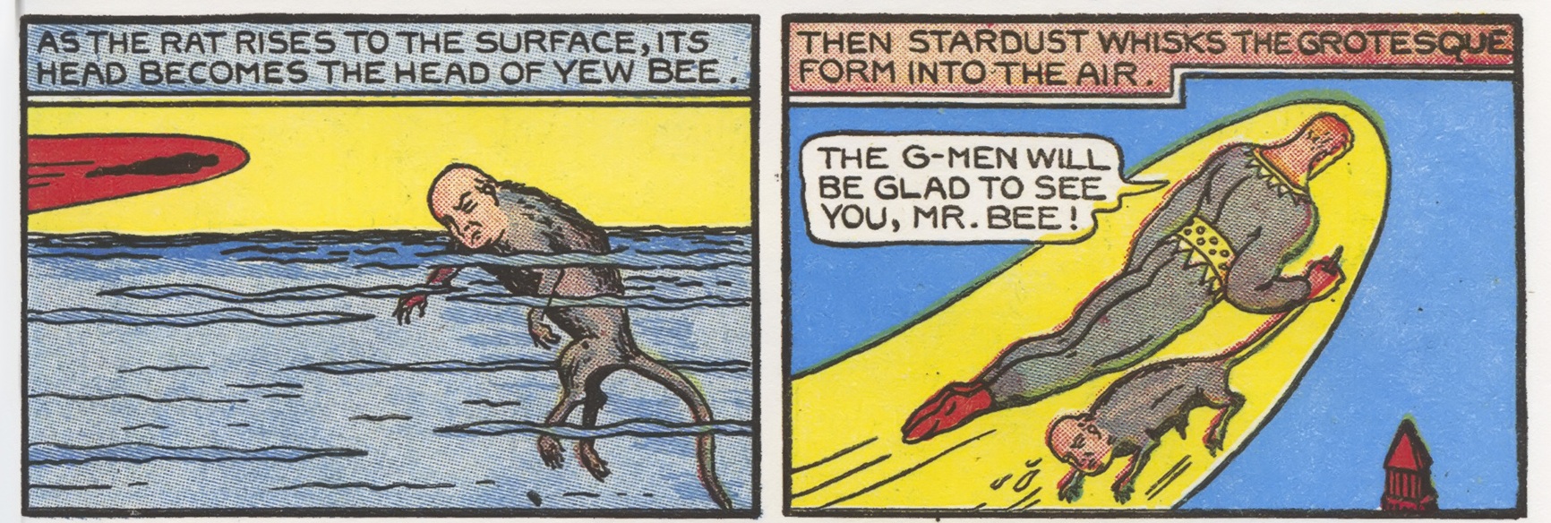 2) Es fácil distinguir un ethos en las historias de Hanks. Básicamente este consiste en que la potencia y el poder triunfan de manera absoluta y que el castigo se descarga de forma total y grandilocuente. Hanks deja a los criminales en planetas de piedras preciosas que nunca podrán levantar y donde vivirán muchísimos años. Los encierra en jaulas de hielo. Los abandona en una cueva donde se convertirán en monstruos que comen tierra y fuego. Como dijo Masotta de Dick Tracy, esta también es una historieta donde lo que importa es el castigo y la destrucción del oponente, no su rehabilitación. De hecho, Hanks compartió escuela de dibujo con Chester Gould, la W.L. Evans School. Pero, a la vez, este castigo, esta destrucción del malvado, es una respuesta a un acto destructivo original en el cual muere muchísima gente. Los planes si comienzan, pero nunca terminan. Las ciudades son atacadas. Los policías mueren a montones intentando detener al villano. Muy alejado de la moralidad moderna del superhéroe. En el fondo, lo que importa, es el choque de fuerzas primordiales y la puesta en riesgo del mundo en el que habitan los personajes de Hanks. A la vez, estos personajes no cuentan, por supuesto, con ninguna motivación, con ningún origen secreto, ni siquiera tienen, poderes consistentes. Tanto Fantomah como Stardust cuentan con el poder de “los rayos”, multiusos y cambiantes de acuerdo a la ocasión. Los héroes demoran en llegar, en salvar al día, en ingresar en la historia, como si no se pudiese castigar más que una vez que se ha cometido un acto siniestro (lo cual es una noción muy en sintonía con la idea de la justicia como realmente funciona en el mundo). Pero una vez que están ahí no hay otro desenlace que la aniquilación absoluta del mal, sin importar que poder ridículo hace falta para ello.
