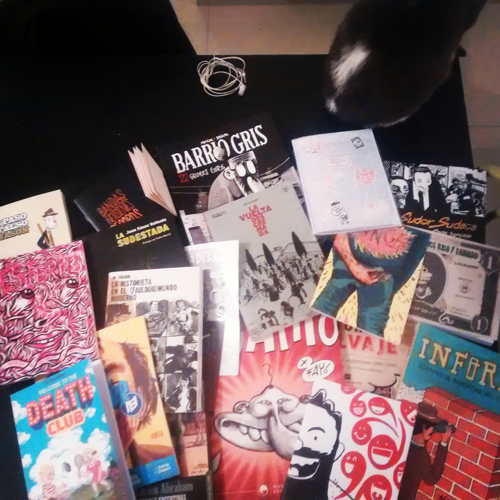 En tercer lugar, una vez que uno se decidía a tratarlo como una feria de compras (que también es eso, al fin y al cabo) lo que se percibe es la increíble prolificidad y multiplicidad de la escena y la industria argentina de historieta. En esta ocasión (casi) solo compré cosas nacionales, y a pesar de que gasté mucha plasta y conseguí la mayoría de lo que quería, viendo las clásicas fotos de botines-después-del-evento de otras personas observaba revistas y libros que no había percibido en el momento pero que me hubiese gustado comprar. Y todas diferentes. En todos los rangos. Desde libros tapa dura hasta fanzines anárquicos y preciosos. Por supuesto que podríamos volver a quejarnos de lo mismo de siempre, de la falta de revistas, de la desaparición de una industria que solo se sostiene en el libro eventual… Pero para eso tenemos todos los otros días de la semana. Hay que destacar es que se está editando mucho y muy bien, con una pata en la recuperación de cosas inaccesibles y otra en la producción de material nuevo, y en gran parte esto también responde al crecimiento de estos eventos, a la lenta y progresiva instauración de un calendario en el marco del cual lanzar cosas y hacerlas circular tiene un sentido. Como dije antes de que comience Comicopolis: las pre-ventas van a arruinar mi economía.