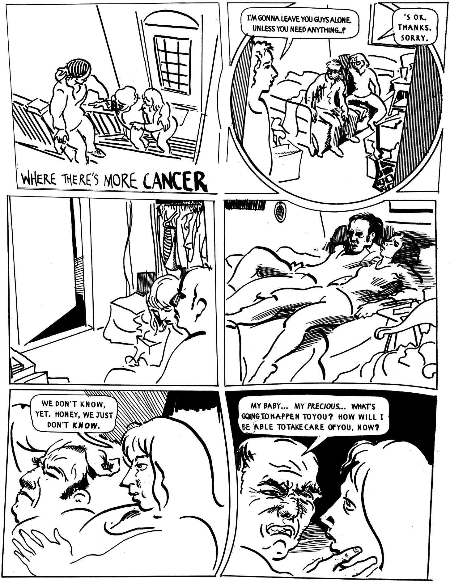 Hasta que no pasás por la experiencia no percibís, o te da igual, o te parece innecesario, que hay una ingente literatura sobre todo aquello que rodea al cáncer. Yo recurrí casi automáticamente a Our Cancer Year de Harvey Pekar y Joyce Brabner. Nunca lo había leído y sabía que era una de las “grandes” de Pekar. Que medio que había dado origen al subgénero de los “cancer comics” que luego, junto con otras cosas, habían terminado derivando en la “graphic medicine”.