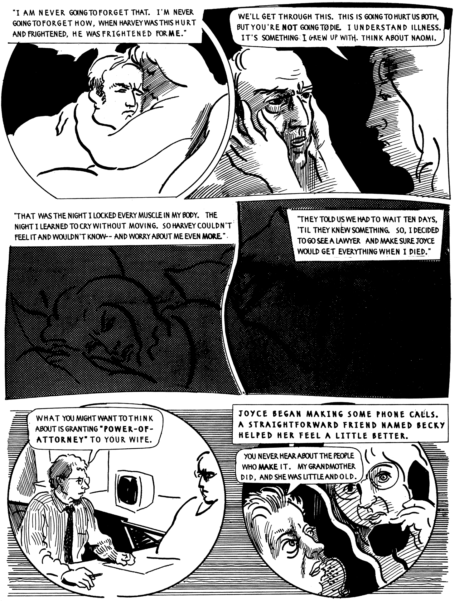 Cuando lo leí me encantó justamente por lo que no es. Por la forma en que Pekar y Brabner mezclan, de la misma forma en que American Splendor lo hizo siempre, lo trágico con lo cotidiano. Por la forma en que aquello que es urgente se disuelve en la rutina. La primera mitad del libro tiene su pulsión narrativa alrededor del deseo de Joyce de mudarse, de comprar una casa, mientras que Harvey tiene sus habituales dudas neuróticas sobre las hipotecas, el quedar atado a una cosa, la disrupción de la que hace mucho tiempo es igual. A pesar de que el departamento que alquilan se está cayendo a pedazos y que una hipoteca les saldría más o menos lo mismo que el alquiler.
