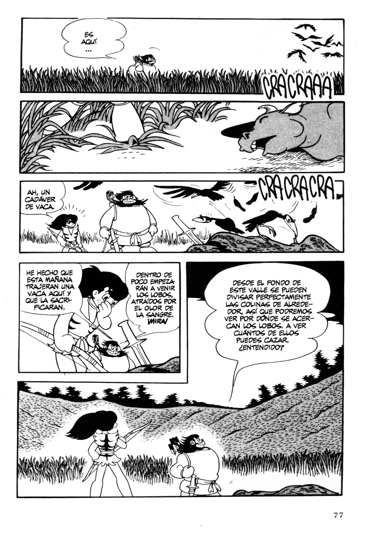 1) En primer lugar, las páginas demuestran la manera en que Tezuka continuamente borronea los límites entre lo cómico, lo trágico, lo violento y la farsa. Los lobos son presentados simultáneamente como una amenaza y como una pandilla de animales cómicos y la violencia que es desatada en su contra, su asesinato, es también mostrado en toda su innecesaria crudeza. Esto es algo que el autor realiza de forma continua, a menudo de un cuadrito a otro, o de un personaje a otro. Algunos personajes tienen detalles cómicos en su cara y sus gestos que aparecen de forma continua y que no atentan contra el pathos de los momentos más tristes de la historieta. Además, Tezuka es un caricaturista genial, que estira y deforma las facetas de sus personajes de forma insospechada y siempre creativa.