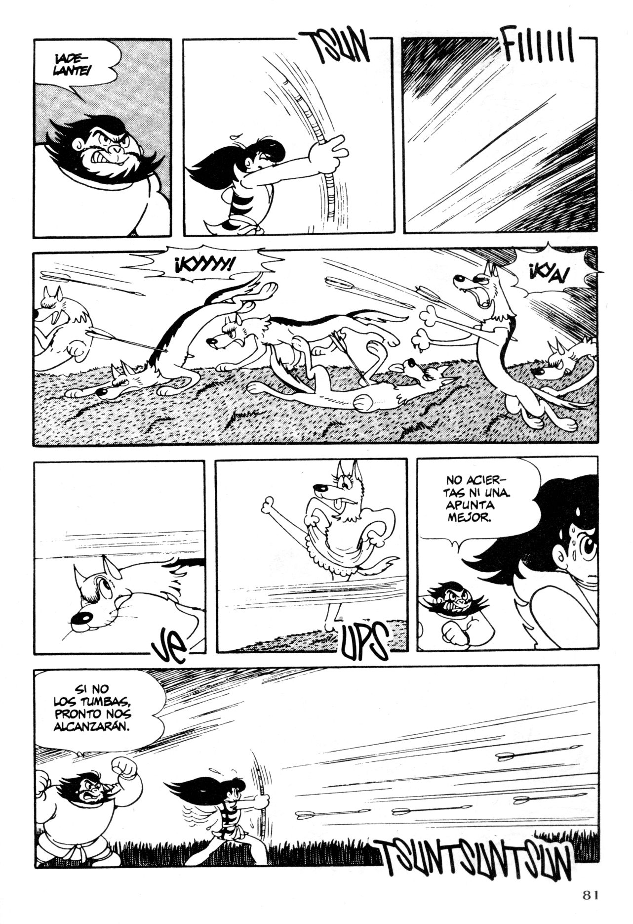 3) Y a la vez parecería haber un cierto mensaje político en todo esto. El último cuadrito donde los lobos se quejan de que tienen hambre les concede una entidad y una empatía que son rápidamente aniquiladas por los protagonistas, retrayéndolos a su posición de enemigos caricaturescos. La práctica de mejorar continuamente tus habilidades para llegar a ser el mejor a la que se somete Nagi bajo el auspicio de Sarutahiko (quién también es uno de los dioses japoneses más prominentes a quién Tezuka decide representar como un humano) es el pilar fundamental del shonen, pero aquí Tezuka lo descarta casi inmediatamente para arrojar la vida de Nagi al caos nuevamente y desarticular la idea de que el perfeccionamiento obsesivo de la técnica puede triunfar sobre el caos de la vida y establecer sus propias convenciones narrativas. De alguna manera Tezuka parecería estar diciéndonos que el comic puede ser mucho más de lo que estamos acostumbrados y que el destino y la suerte se pueden torcer en un instante, abandonando los clichés y los lugares comunes. Y lo demuestra casi de forma natural mezclando estilos y tonos en una práctica que está teñida de la búsqueda continua del mejoramiento de su trazo, en su negativa a abandonarse a los laureles ya conquistados, en una curiosidad rampante.