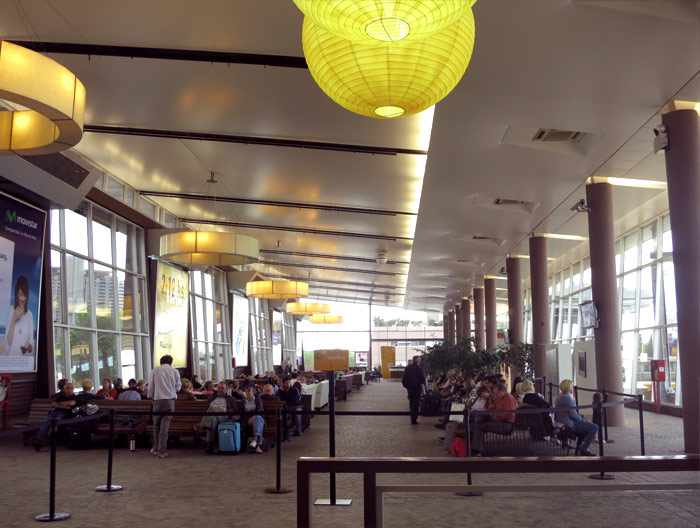 La terminal de Buenos Aires de Buquebus y Seacat es ultra modernosa, fría y desagradable. Tiene esas curiosas placas de metal con agua chorreando constantemente. En su segundo piso, la sala de espera. La gente se acumula, espera, hace una cola interminable de 30 minutos para darse el lujo de tener una mejor ubicación en el barquito.